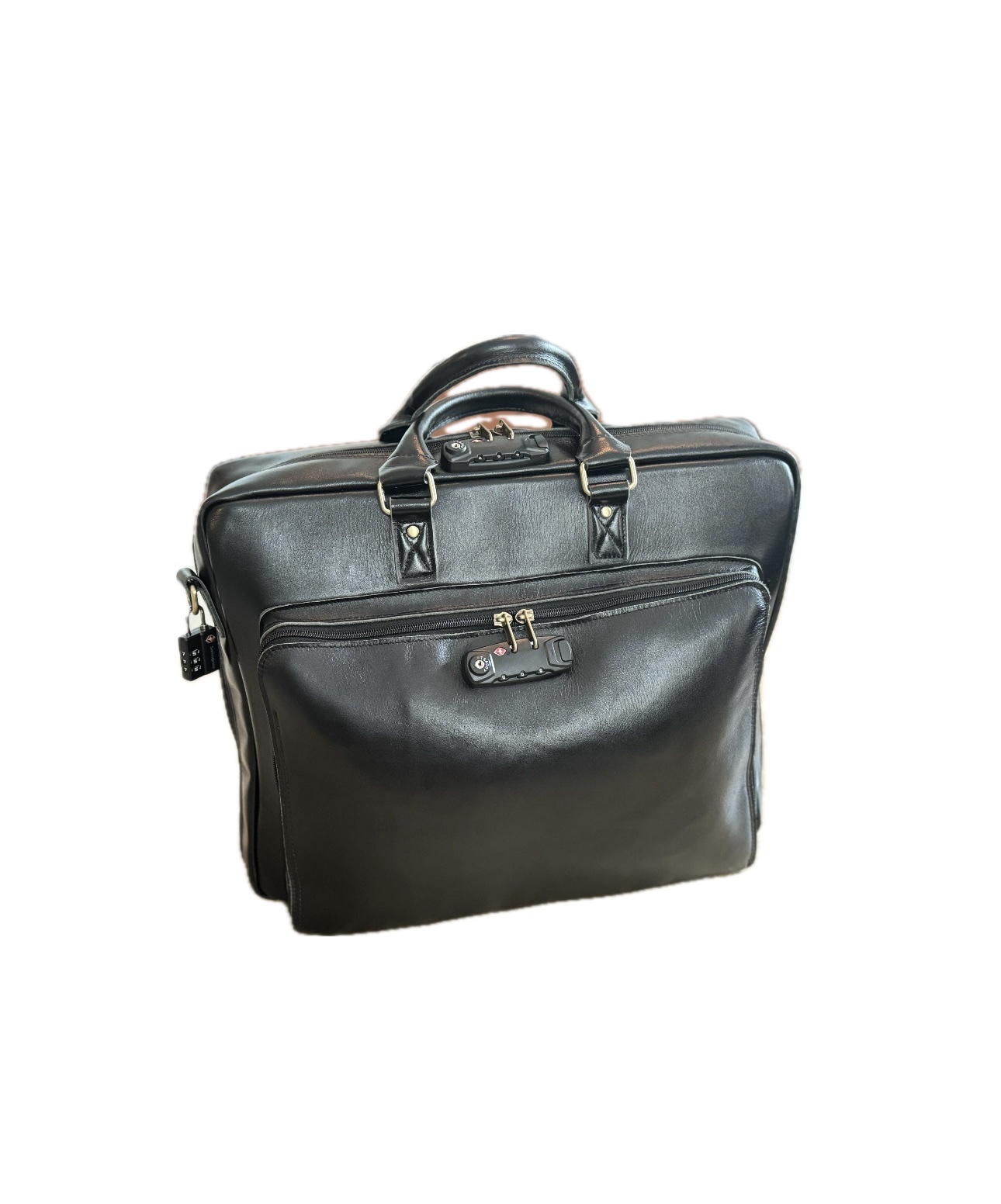 -A sleek, black leather layover bag with built-in security for modern travelers.